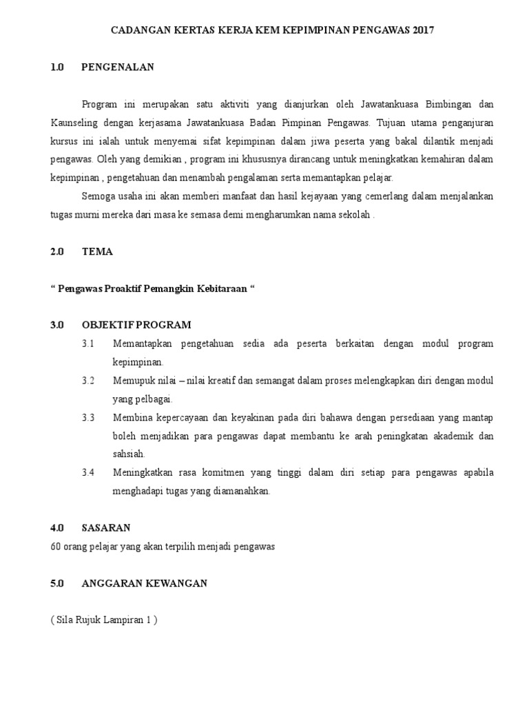 Cadangan Kertas Kerja Kem Kepimpinan Pengawas 2017 Pdf